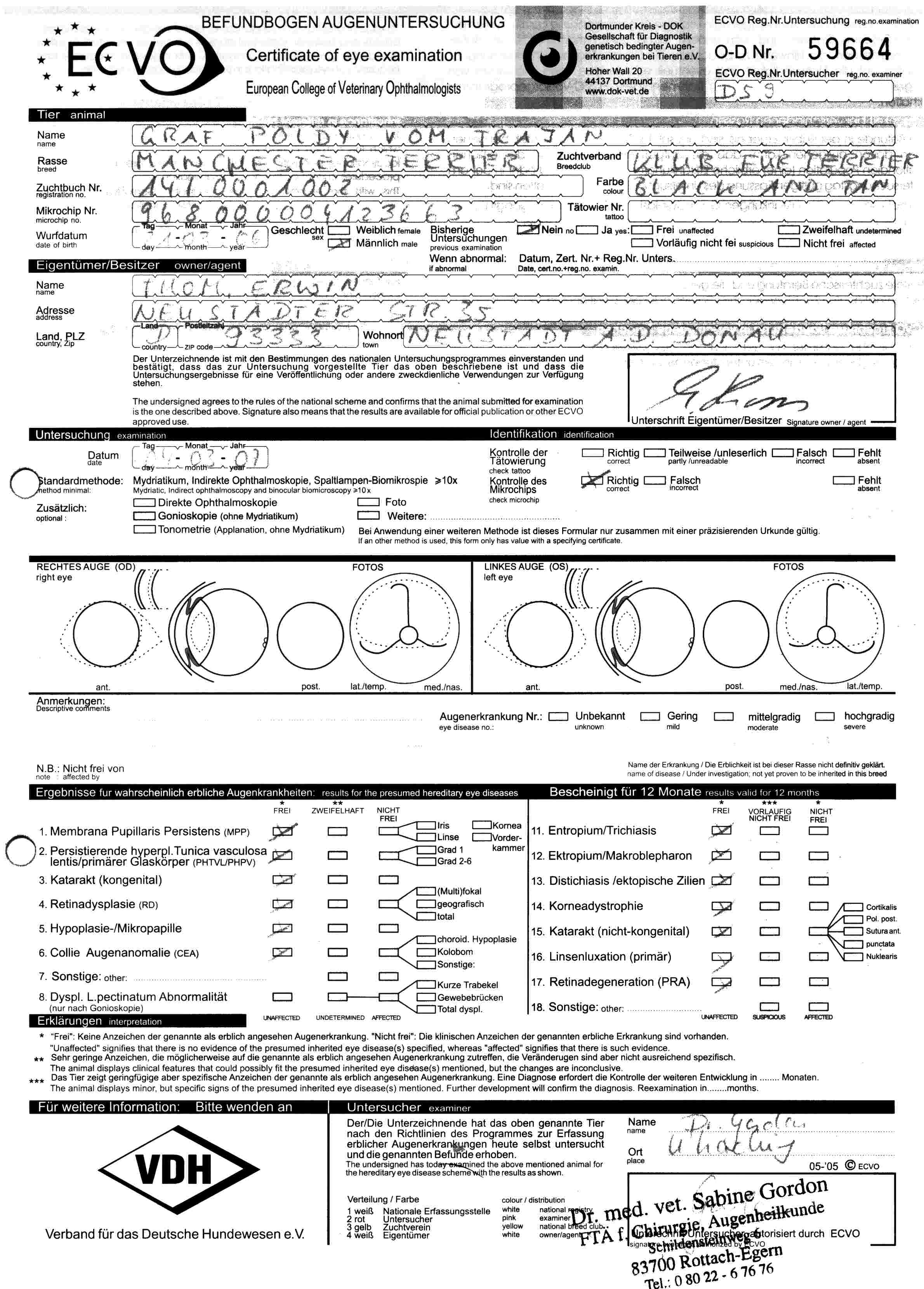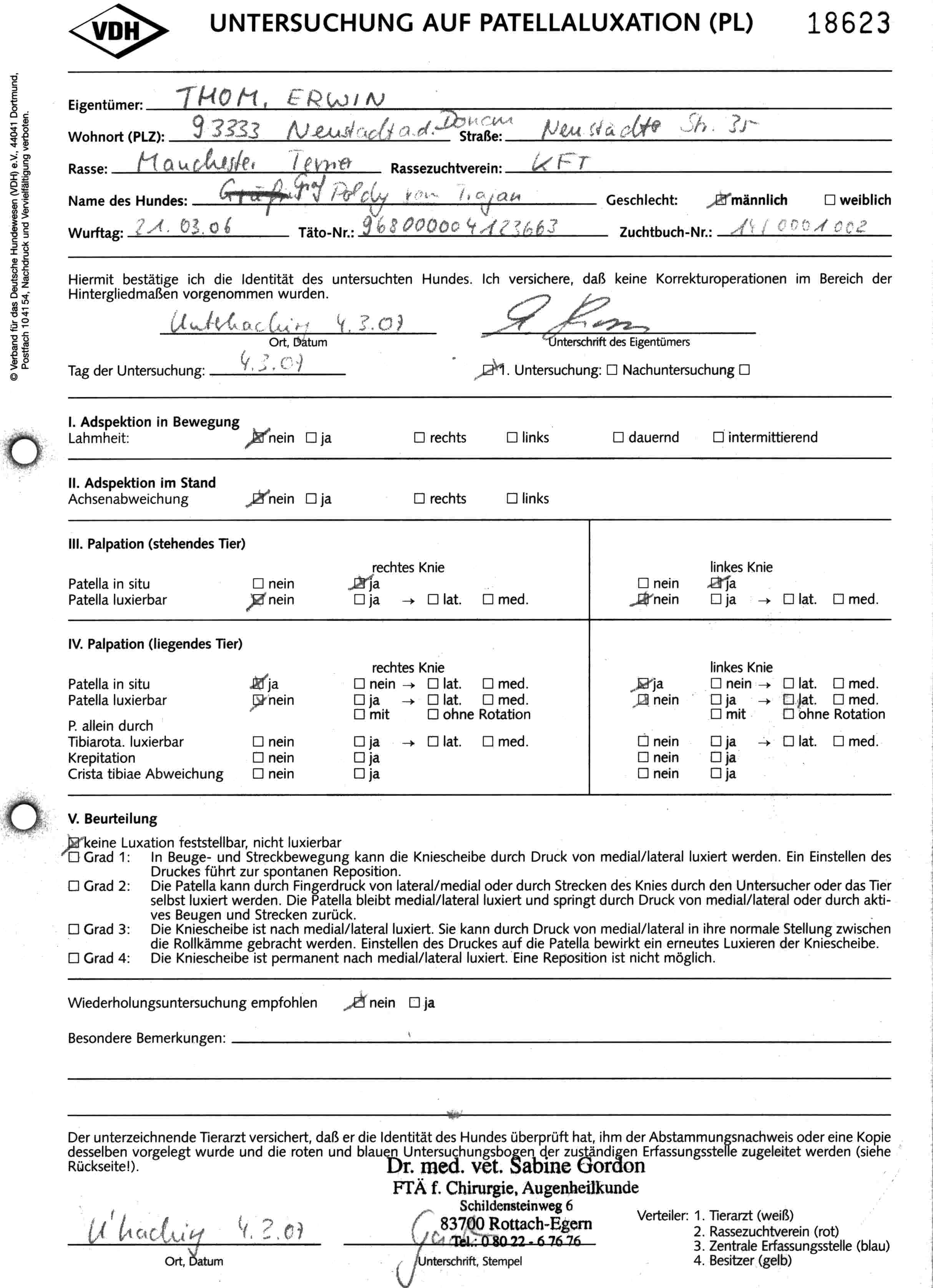 Im rahmen der Spezialzuchtschau der OG. München hat Graf Poldy vom Trajan seine Zuchtzulassung mit einem spitzen Ergebniss bestanden.  Da hier auch die Möglichkeit war die Hunde auf Patella und PRA untersuchen lassen, haben wir dies selbstverständlich auch gemacht. Graf Poldy und Gräfin Gisha sind frei von beiden Krankheiten.
