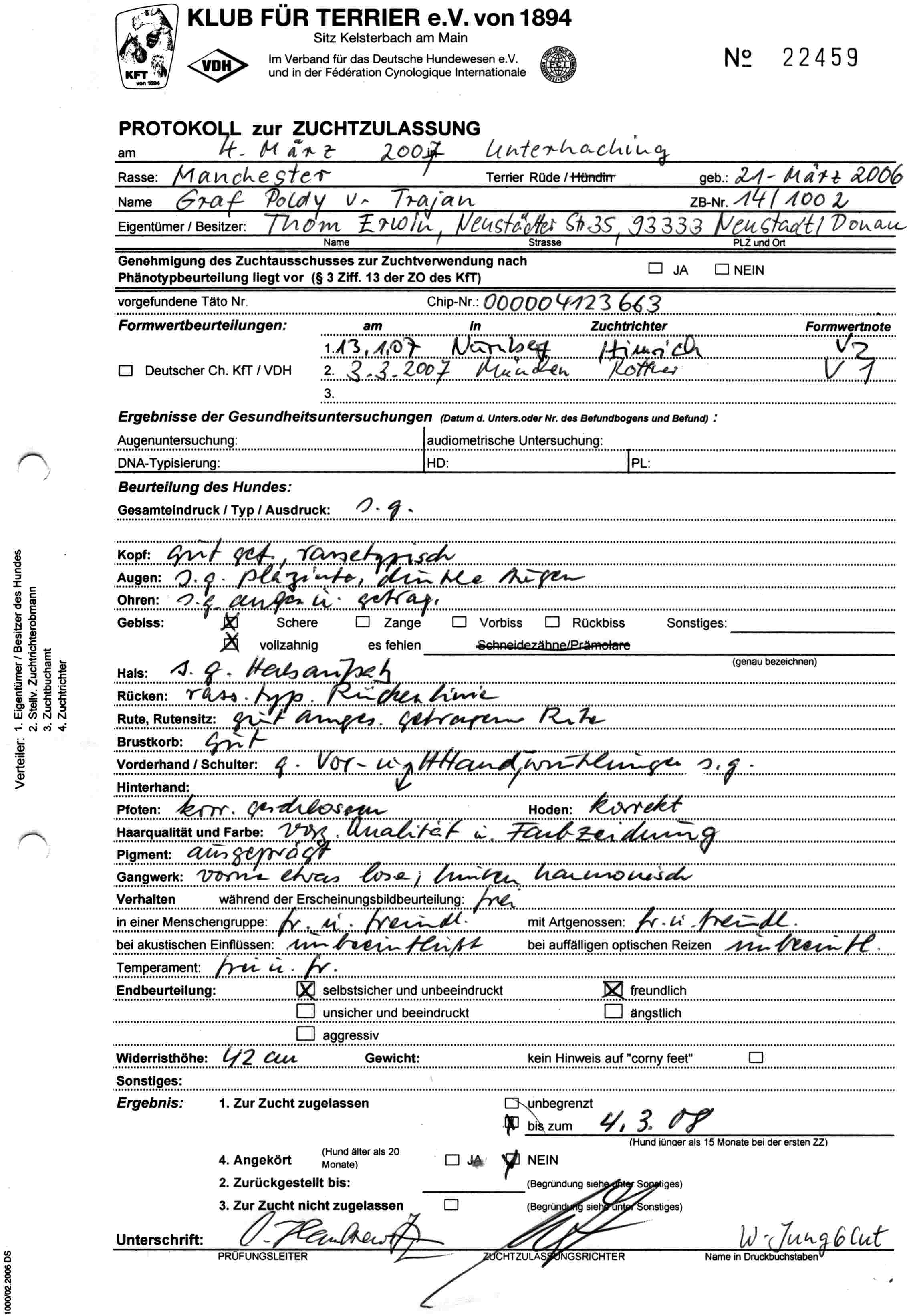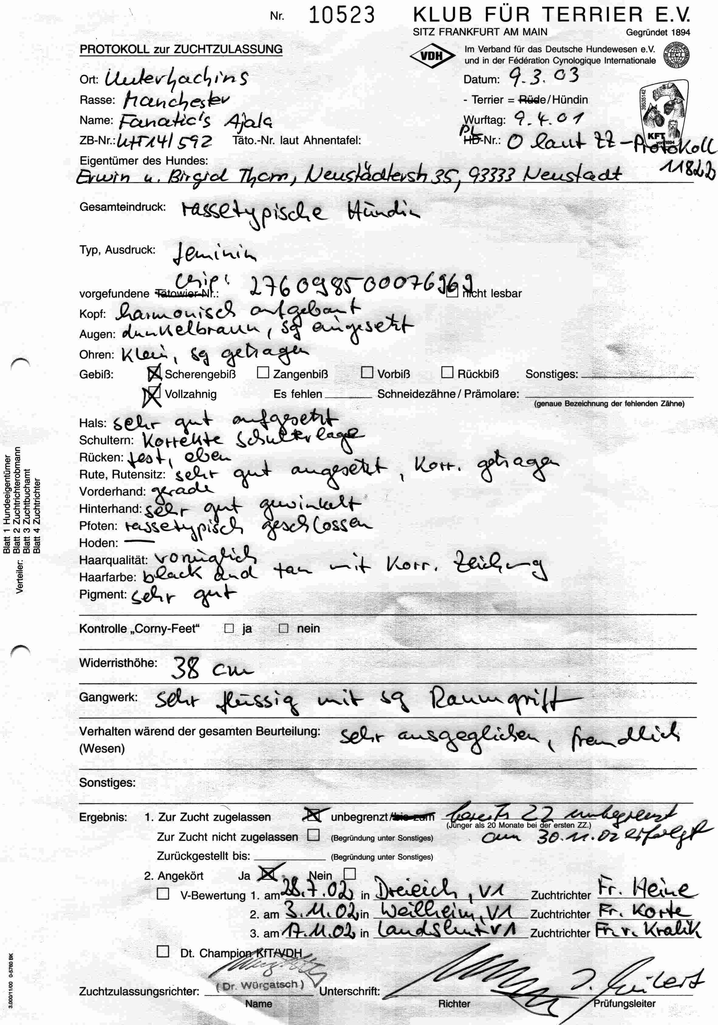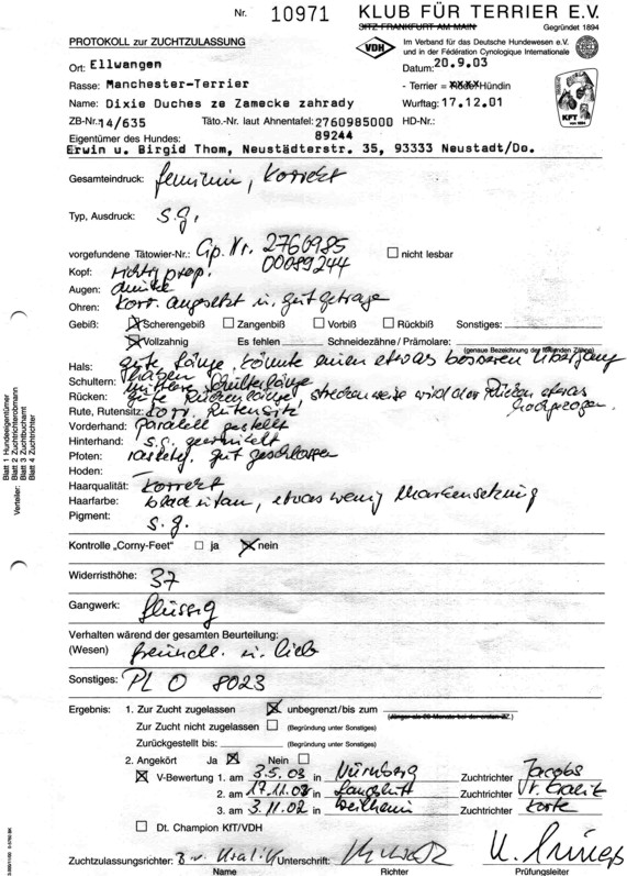 Weiter gings im Eiltempo zur Zuchtzulassung. Wie zuvor von Herrn Himmrich, wurde auch bei der ZZL durch Frau Freeksen das freundliche und aufgeschlossene Wesen des Manchester Terrier Rüden hoch gelobt. Hutch erhielt die Zuchtzulassung auf Lebzeit ohne Einschränkungen.