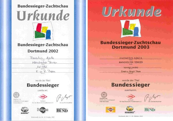Bei der Bundessiegerschau am 18.11.2003 in Tulln - Österreich wurde unsere Ajala als erster Manchester Terrier der Titel - Österreichischer Klubchampion - durch den Präsidenten des ÖKfT. Herrn Dir. Rocco Andorfer und dem Ausstellungsreferenten Herrn Ernst Mayer verliehen.