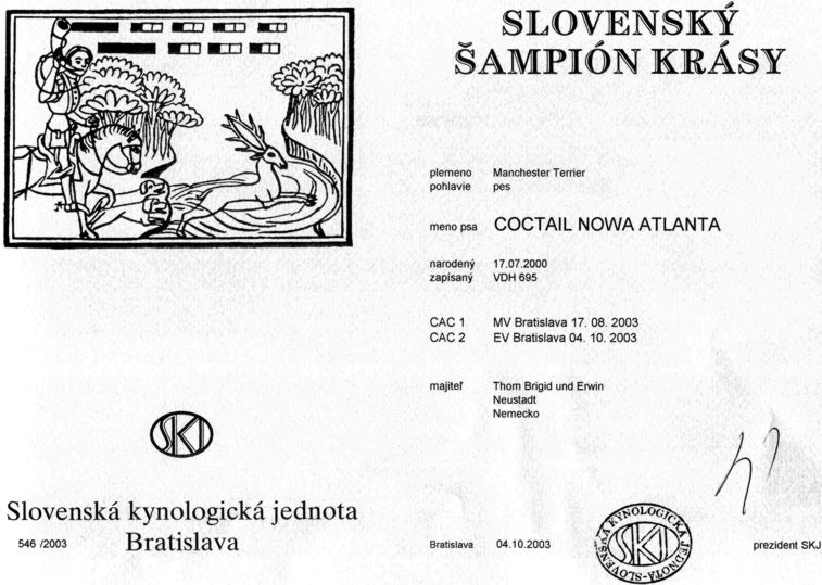 Ein überaus erfolgreiches Wochenende hatten wir mit unseren Hunden u.a. am 04.10.2003 bei der FCI - Europasiegerschau in der Slovakei (Bratislava). Coctail erhielt in der Offenen Klasse V 1 und hatte somit seinen Konkurrenten den Weltsieger 2001 auf den 2. Platz verwiesen. Noch am selben Tag erhielten wir für  Coctail die Urkunde und somit die Ernennung zum  Slowakischen Champion.