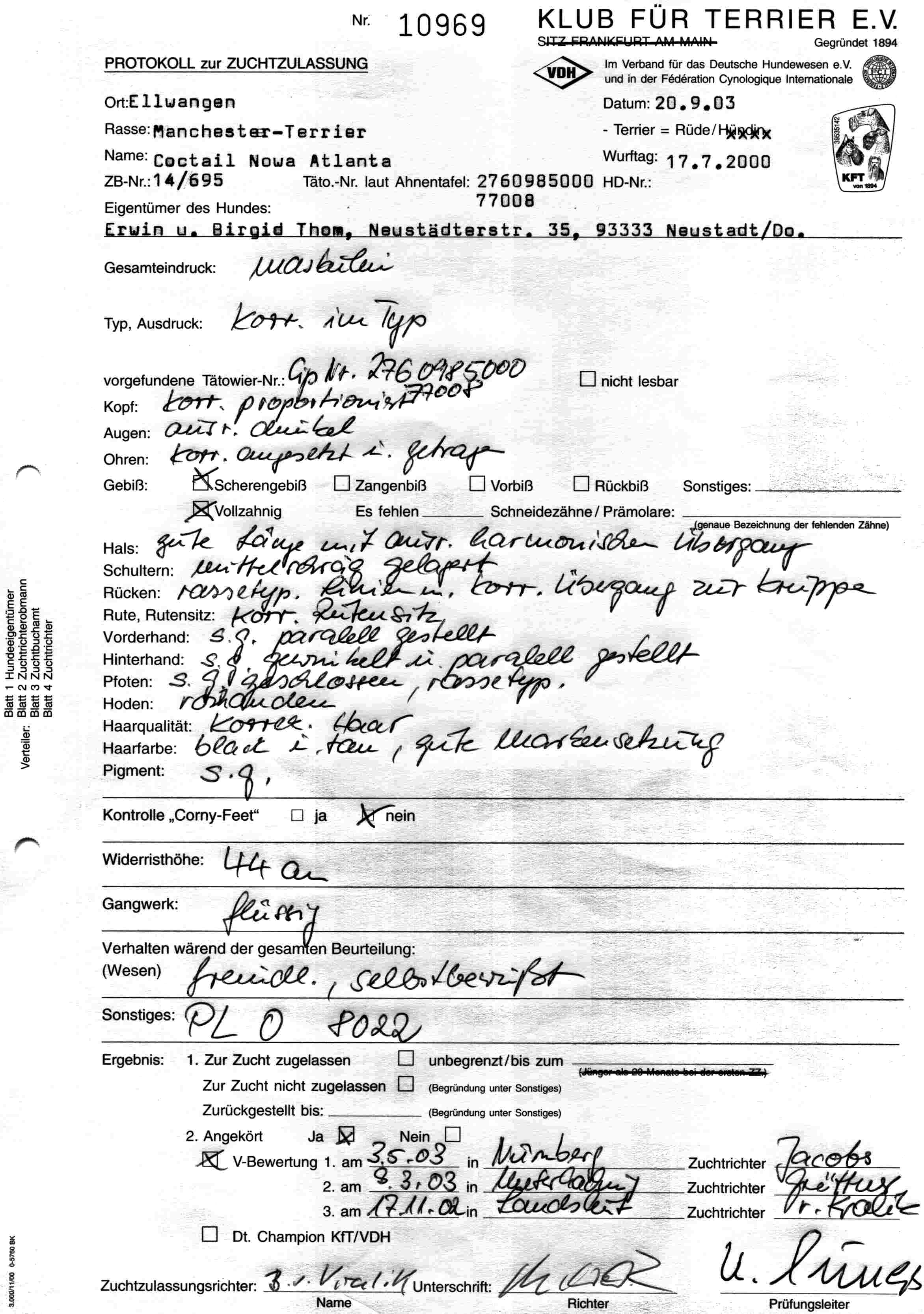In Ellwangen am 20.09.2003 hat Coctail die Körung auf Lebzeit als bester Manchester Terrier bestanden. Unsere Dixie zeigte sich ebenfalls von ihrer besten Seite und bestand als beste MT Hündin die Körung, natürlich auch auf Lebzeit.