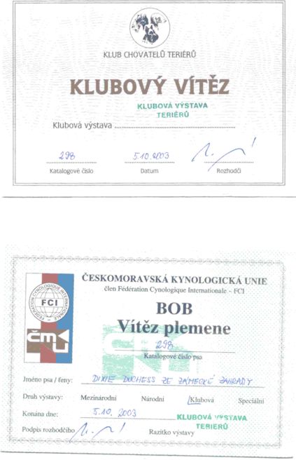 Unsere Dixie zeigte es allen was in ihr steckt. Am Sonntag 05.10.2003 in Tschechien (Prag) bei der Klubsiegerschau des Tschechischen Terrier Klub erhielt sie in der Offenen Klasse V 1, den  Titel Klubsieger 2003 und das BOB. Beim Wettbewerb um das BOB, welches Dixie gewann, mußte sich der Weltsieger und Europasieger 2003 mit den hinteren Plätzen zufieden geben.